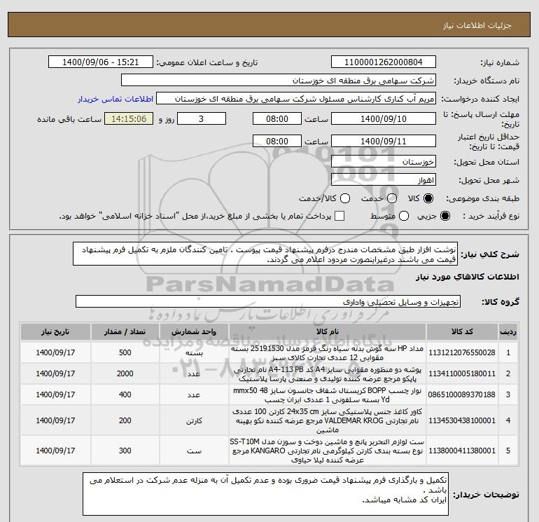 شرح کلی نیاز: نوشت افزار طبق مشخصات مندرج درفرم پیشنهاد قیمت پیوست . تامین کنندگان ملزم به تکمیل فرم پیشنهاد قیمت می باشند درغیراینصورت مردود اعلام می گردند.