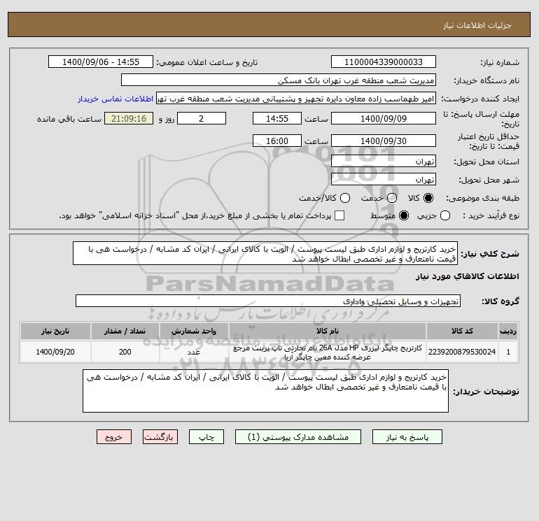 شرح کلی نیاز: خرید کارتریج و لوازم اداری طبق لیست پیوست / الویت با کالای ایرانی / ایران کد مشابه / درخواست هی با قیمت نامتعارف و غیر تخصصی ابطال خواهد شد