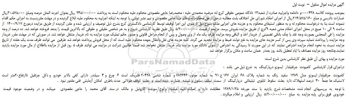 بموجب پرونده کلاسه 0000438و دادنامه واجراییه صادره از شعبه13 دادگاه عمومی حقوقی کرج له: مرضیه محمدی علیه : محمدرضا حاجی مقصودی محکوم علیه محکوم است به پرداخت 245/000/000 ریال بعنوان اجرت المثل عرصه ومبلغ 30،575،000ریال خسارات دادرسی و مبلغ 214/575/160ریال از اجرای احکام شورای حل اختلاف بابت مطالبه درحق درحق محکوم له وخانم مینا حاجی مقصودی و نیم عشر دولتی. با توجه به اینکه اجراییه به محکوم علیه ابلاغ گردیده و در مهلت مقررنسبت به اجرای حکم اقدام ننموده است بنا به درخواست محکوم له و به منظور استیفای محکوم به و هزینه های اجرایی ملک بشرح ذیل از سوی این اجرا توقیف توسط کارشناسی دادگستری کرج بشرح ذیل توصیف و ارزیابی شده و مقرر گردیده از طریق مزایده درمورخ 1400/9/17  از ساعت 9 الی 10 صبح در محل اجرای احکام مدنی شعبه 9کرج از طریق مزایده بفروش برسد. مزایده از قیمت 5/200/000/000 ریال طبق نظریه کارشناس شروع و به هر شخص حقیقی و حقوقی که بالاترین قیمت را بدهد فروخته خواهد شد. ده درصد از وجه مزایده را فی المجلس بصورت وجه نقد یا چک بانکی تضمینی از خریدار اخذ و الباقی وجه مزایده ظرف یک ماه از وی وصول و پس از انجام مراحل قانونی و صدور حکم تملیک مورد مزایده به نام خریدار منتقل خواهد شد. در صورتی که در مهلت مقرر خریدار وجه مزایده را پرداخت ننماید سپرده وی پس از کسر هزینه های مزایده به نفع دولت ضبط و مزایده تجدید می گردد. کلیه هزینه های نقل وانتقال بعهده محکوم علیه است که از محل فروش پرداخت خواهد شد طرفین  می توانند ظرف مدت یک هفته از تاریخ مزایده نسبت به نحوه انجام مزایده اعتراض نمایند که در این صورت تا رسیدگی به اعتراض از سوی دادگاه مورد مزایده بنام خریدار منتقل نخواهد شد ضمنا طالبین شرکت در مزایده می توانند ظرف 5 روز قبل از مزایده بااطلاع از مال مورد مزایده بازدید نمایند.چنانجه روز مزایده مصادف با ایام تعطیل باشد روز بعددر  همان ساعت و مکان برگزار خواهد شد