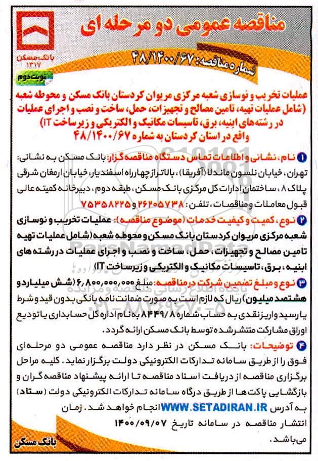 عملیات تخریب و نوسازی شعبه مرکزی مریوان کردستان بانک مسکن و محوطه شعبه (شامل عملیات تهیه، تامین مصالح و تجهیزات، حمل، ساخت و نصب و اجرای عملیات در رشته های ابنیه، برق، تاسیسات مکانیک و الکتریکی و زیر ساخت IT) واقع در استان کردستان به شماره 67/ 1400/ 48