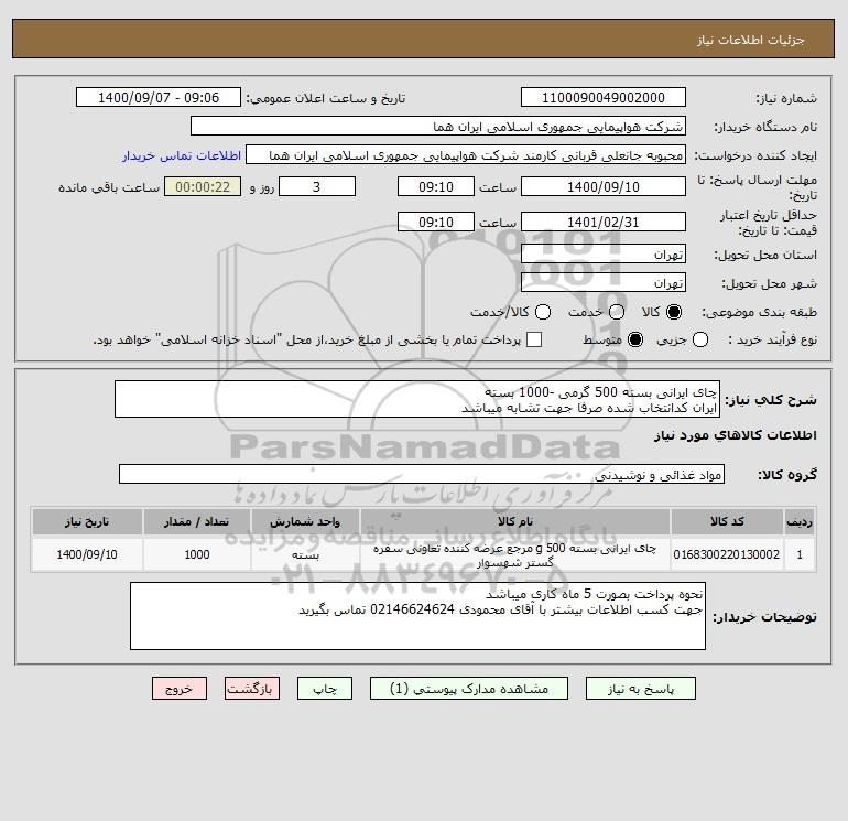 شرح کلی نیاز: چای ایرانی بسته 500 گرمی -1000 بسته ایران کدانتخاب شده صرفا جهت تشابه میباشد