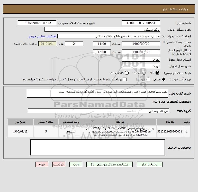 شرح کلی نیاز: پمپ سیرکولاتور خطی(طبق مشخصات قید شده در پیش فاکتور)ایران کد مشابه است