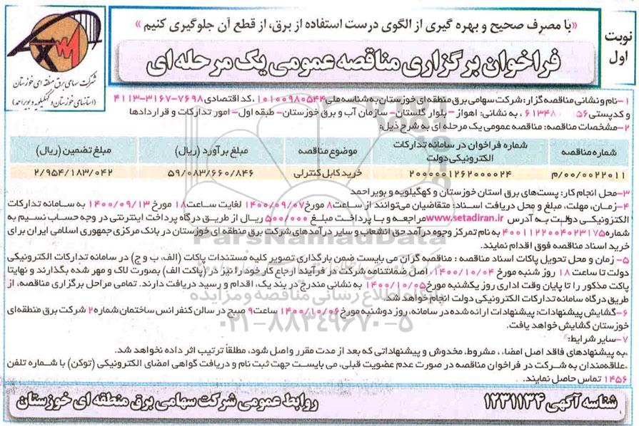 مناقصه خرید کابل کنترلی , مناقصه خرید کابل کنترلی
