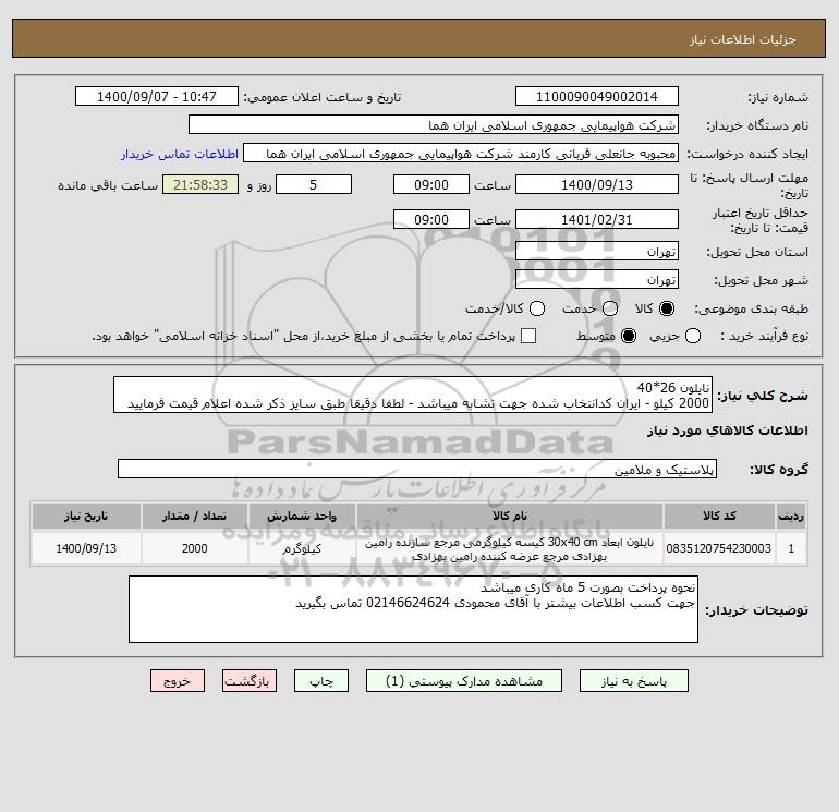 شرح کلی نیاز: نایلون 26*40 2000 کیلو - ایران کدانتخاب شده جهت تشابه میباشد - لطفا دقیقا طبق سایز ذکر شده اعلام قیمت فرمایید