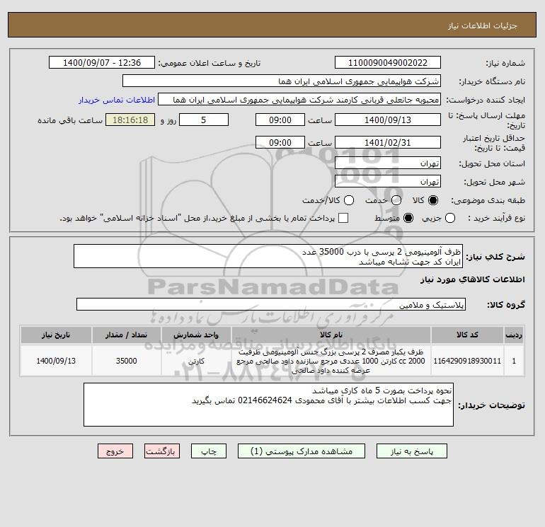 شرح کلی نیاز: ظرف آلومینیومی 2 پرسی با درب 35000 عدد