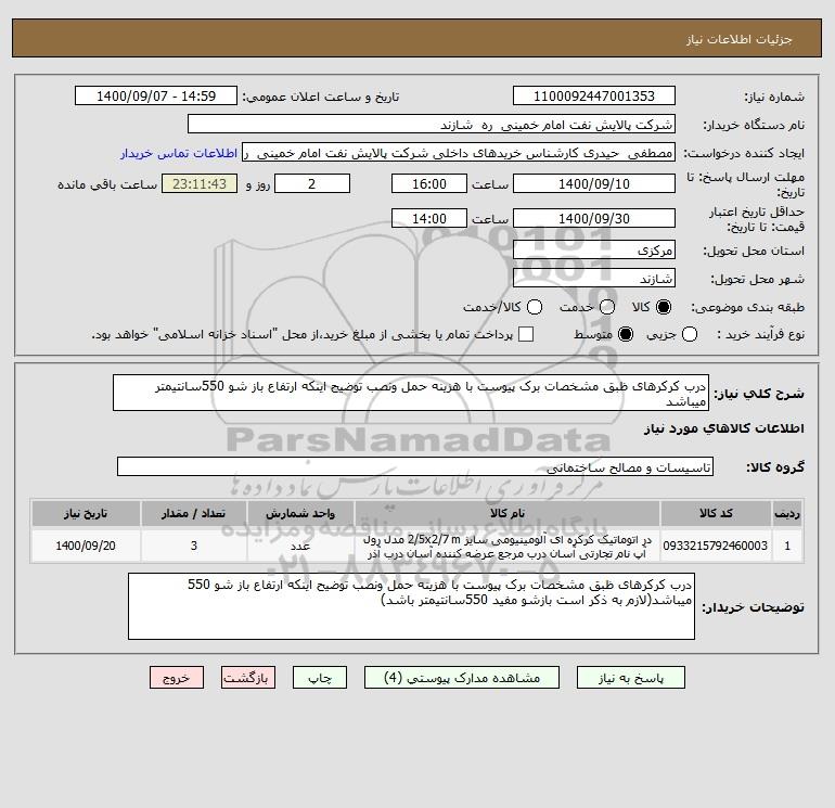 استعلام درب کرکرهای ظبق مشخصات برک پیوست با هزینه حمل ونصب توضیح اینکه ارتفاع باز شو 550سانتیمتر میباشد, استعلام درب کرکرهای ظبق مشخصات برک پیوست با هزینه حمل ونصب توضیح اینکه ارتفاع باز شو 550سانتیمتر میباشد