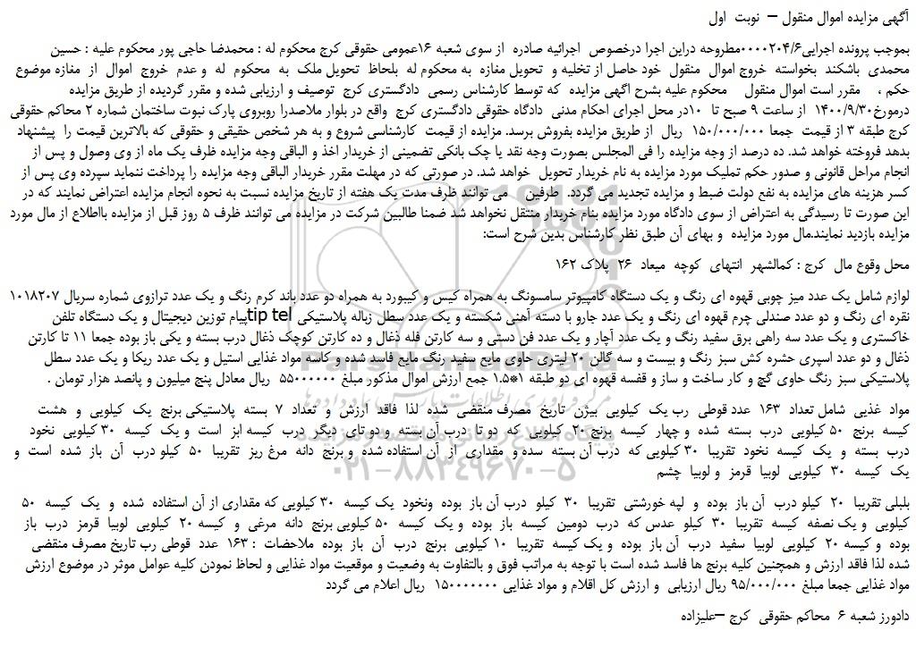 بموجب پرونده اجرایی0000204/6مطروحه دراین اجرا درخصوص اجرائیه صادره از سوی شعبه 16عمومی حقوقی کرج محکوم له : محمدضا حاجی پور محکوم علیه : حسین محمدی باشکند بخواسته خروج اموال منقول خود حاصل از تخلیه و تحویل مغازه به محکوم له بلحاظ تحویل ملک به محکوم له و عدم خروج اموال از مغازه موضوع حکم ، مقرر است اموال منقول محکوم علیه بشرح اگهی مزایده که توسط کارشناس رسمی دادگستری کرج توصیف و ارزیابی شده و مقرر گردیده از طریق مزایده درمورخ1400/9/30 از ساعت 9 صبح تا 10در محل اجرای احکام مدنی دادگاه حقوقی دادگستری کرج واقع در بلوار ملاصدرا روبروی پارک نبوت ساختمان شماره 2 محاکم حقوقی کرج طبقه 3 از قیمت جمعا 150/000/000 ریال از طریق مزایده بفروش برسد. مزایده از قیمت کارشناسی شروع و به هر شخص حقیقی و حقوقی که بالاترین قیمت را پیشنهاد بدهد فروخته خواهد شد. ده درصد از وجه مزایده را فی المجلس بصورت وجه نقد یا چک بانکی تضمینی از خریدار اخذ و الباقی وجه مزایده ظرف یک ماه از وی وصول و پس از انجام مراحل قانونی و صدور حکم تملیک مورد مزایده به نام خریدار تحویل خواهد شد. در صورتی که در مهلت مقرر خریدار الباقی وجه مزایده را پرداخت ننماید سپرده وی پس از کسر هزینه های مزایده به نفع دولت ضبط و مزایده تجدید می گردد. طرفین می توانند ظرف مدت یک هفته از تاریخ مزایده نسبت به نحوه انجام مزایده اعتراض نمایند که در این صورت تا رسیدگی به اعتراض از سوی دادگاه مورد مزایده بنام خریدار منتقل نخواهد شد ضمنا طالبین شرکت در مزایده می توانند ظرف 5 روز قبل از مزایده بااطلاع از مال مورد مزایده بازدید نمایند.مال مورد مزایده و بهای آن طبق نظر کارشناس بدین شرح است: