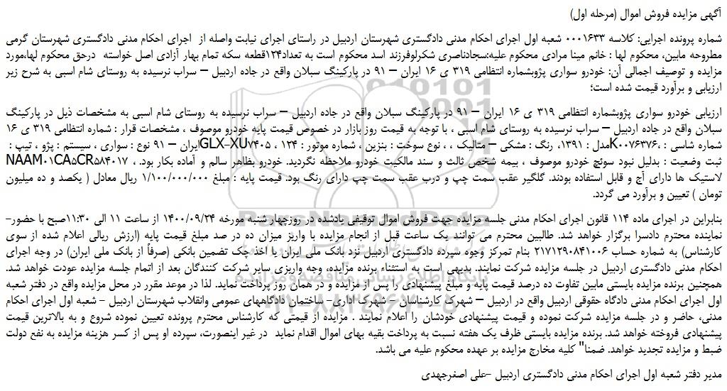شماره پرونده اجرایی: کلاسه 0001633 شعبه اول اجرای احکام مدنی دادگستری شهرستان اردبیل در راستای اجرای نیابت واصله از اجرای احکام مدنی دادگستری شهرستان گرمی مطروحه مابین، محکوم لها : خانم مینا مرادی محکوم علیه:سجادناصری شکرلوفرزند اسد محکوم است به تعداد124قطعه سکه تمام بهار آزادی اصل خواسته درحق محکوم لها،مورد مزایده و توصیف اجمالی آن: خودرو سواری پژوبشماره انتظامی 319 ی 16 ایران – 91 در پارکینگ سبلان واقع در جاده اردبیل – سراب نرسیده به روستای شام اسبی به شرح زیر ارزیابی و برآورد قیمت شده است؛