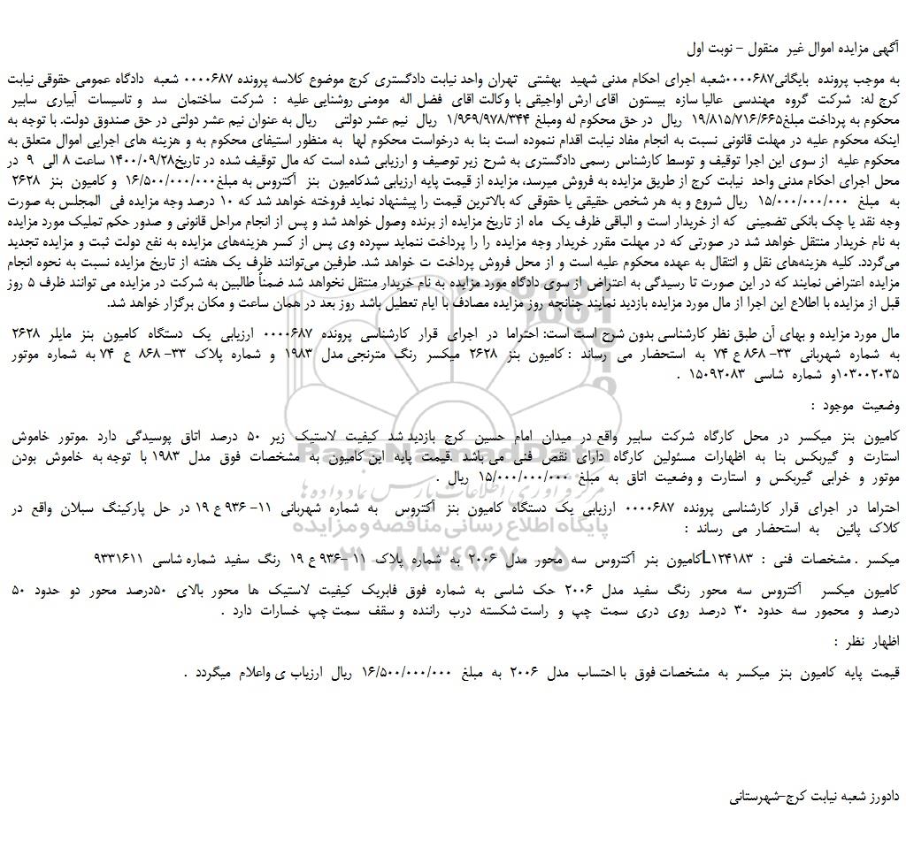 به موجب پرونده بایگانی0000687شعبه اجرای احکام مدنی شهید بهشتی تهران واحد نیابت دادگستری کرج موضوع کلاسه پرونده 0000687 شعبه دادگاه عمومی حقوقی نیابت کرج له: شرکت گروه مهندسی عالیا سازه بیستون اقای ارش اواجیقی با وکالت اقای فضل اله مومنی روشنایی علیه : شرکت ساختمان سد و تاسیسات آبیاری سابیر محکوم به پرداخت مبلغ19/815/716/665 ریال در حق محکوم له ومبلغ 1/969/978/344 ریال نیم عشر دولتی ریال به عنوان نیم عشر دولتی در حق صندوق دولت. با توجه به اینکه محکوم علیه در مهلت قانونی نسبت به انجام مفاد نیابت اقدام ننموده است بنا به درخواست محکوم لها به منظور استیفای محکوم به و هزینه های اجرایی اموال متعلق به محکوم علیه از سوی این اجرا توقیف و توسط کارشناس رسمی دادگستری به شرح زیر توصیف و ارزیابی شده است که مال توقیف شده در تاریخ1400/09/28 ساعت 8 الی 9 در محل اجرای احکام مدنی واحد نیابت کرج از طریق مزایده به فروش میرسد، مزایده از قیمت پایه ارزیابی شدکامیون بنز آکتروس به مبلغ16/500/000/000 و کامیون بنز 2628 به مبلغ 15/000/000/000 ریال شروع و به هر شخص حقیقی یا حقوقی که بالاترین قیمت را پیشنهاد نماید فروخته خواهد شد که 10 درصد وجه مزایده فی المجلس به صورت وجه نقد یا چک بانکی تضمینی که از خریدار است و الباقی ظرف یک ماه از تاریخ مزایده از برنده وصول خواهد شد و پس از انجام مراحل قانونی و صدور حکم تملیک مورد مزایده به نام خریدار منتقل خواهد شد در صورتی که در مهلت مقرر خریدار وجه مزایده را را پرداخت ننماید سپرده وی پس از کسر هزینه های مزایده به نفع دولت ثبت و مزایده تجدید می گردد. کلیه هزینه های نقل و انتقال به عهده محکوم علیه است و از محل فروش پرداخت ت خواهد شد. طرفین می توانند ظرف یک هفته از تاریخ مزایده نسبت به نحوه انجام مزایده اعتراض نمایند که در این صورت تا رسیدگی به اعتراض از سوی دادگاه مورد مزایده به نام خریدار منتقل نخواهد شد ضمناً طالبین به شرکت در مزایده می توانند ظرف 5 روز قبل از مزایده با اطلاع این اجرا از مال مورد مزایده بازدید نمایند چنانچه روز مزایده مصادف با ایام تعطیل باشد روز بعد در همان ساعت و مکان برگزار خواهد شد.