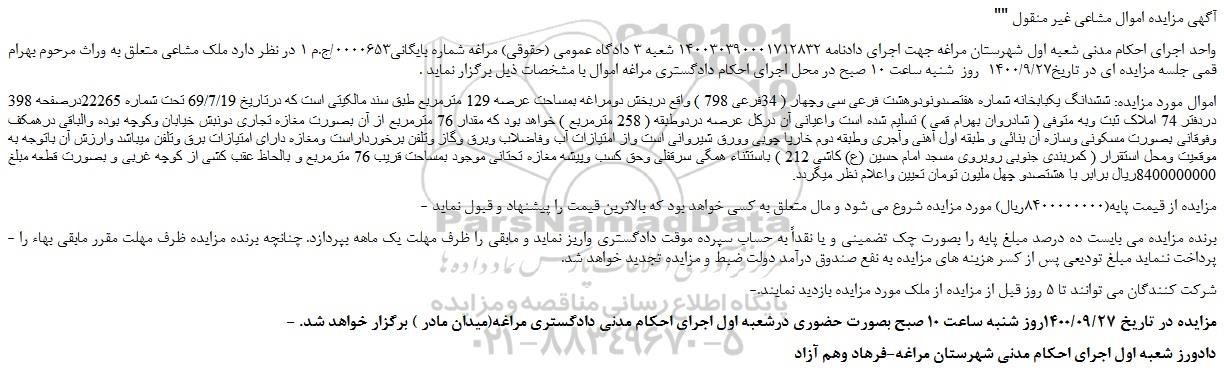 "آگهی مزایده اموال مشاعی غیر منقول "