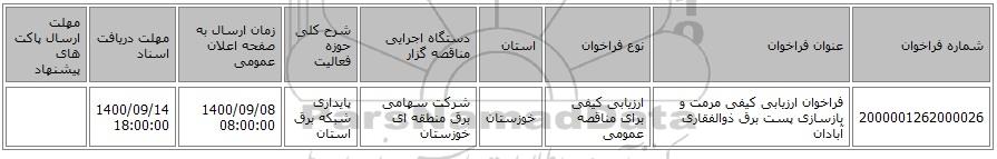 مناقصه، فراخوان ارزیابی کیفی مرمت و بازسازی پست برق ذوالفقاری آبادان, فراخوان ارزیابی کیفی مرمت و بازسازی پست برق ذوالفقاری آبادان