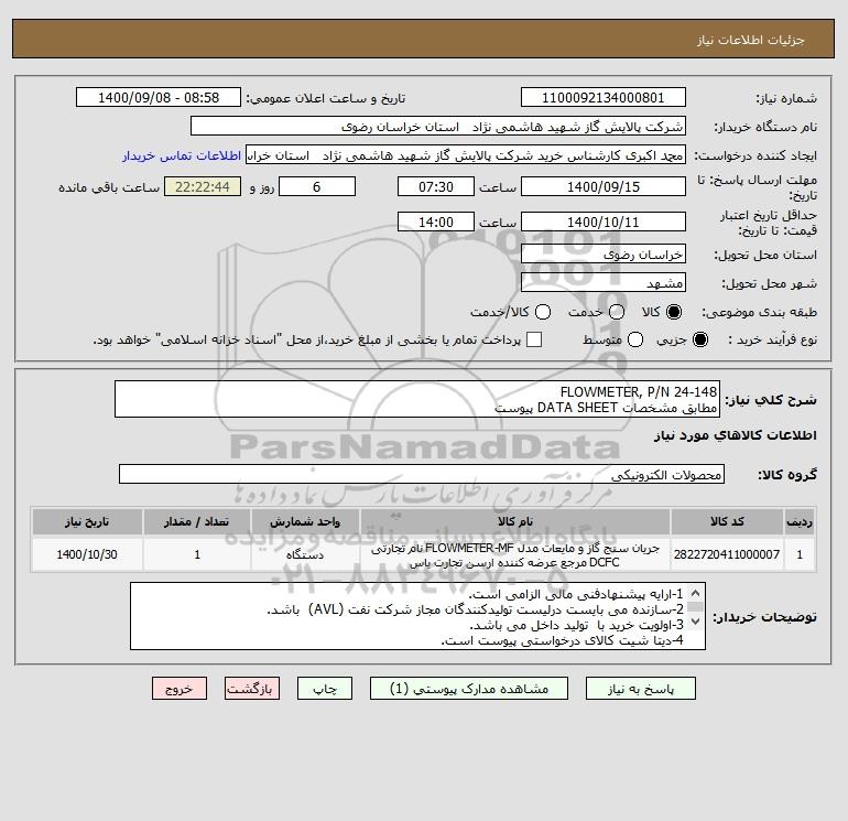 شرح کلی نیاز: FLOWMETER, P/N 24-148