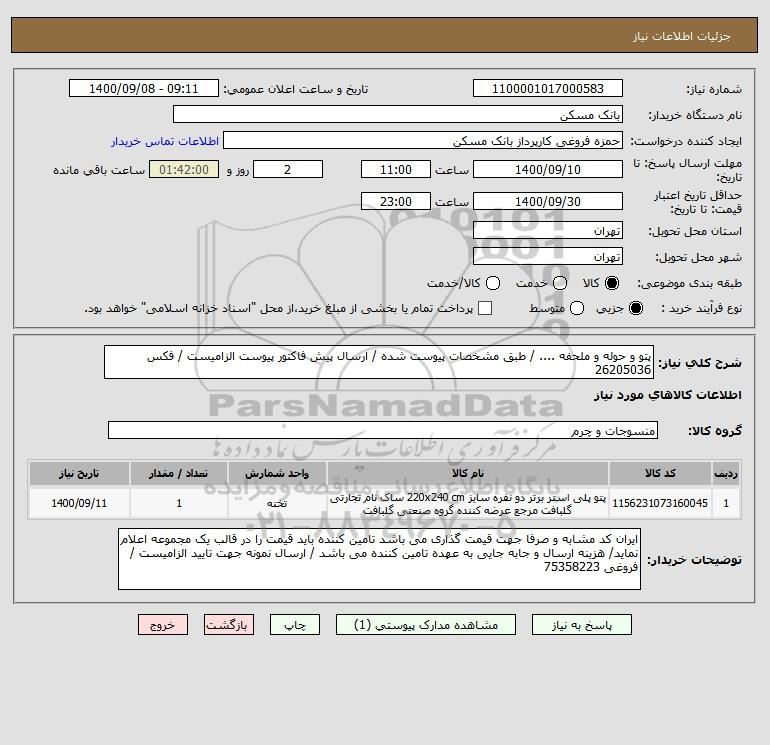 شرح کلی نیاز: پتو و حوله و ملحفه .... / طبق مشخصات پیوست شده / ارسال پیش فاکتور پیوست الزامیست / فکس 26205036