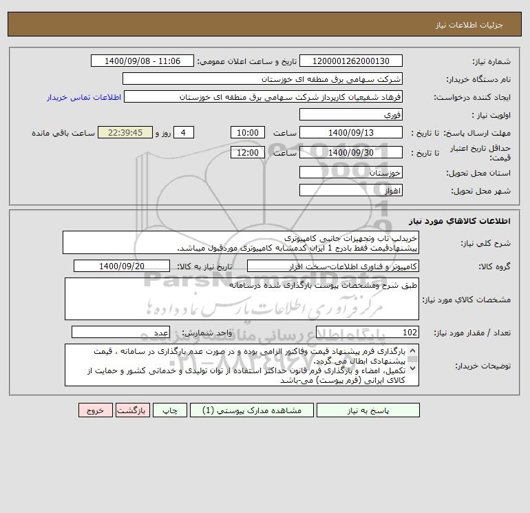 شرح کلی نیاز: خریدلپ تاب وتجهیزات جانبی کامپیوتری پیشنهادقیمت فقط بادرج 1 ایران کدمشابه کامپیوتری موردقبول میباشد.