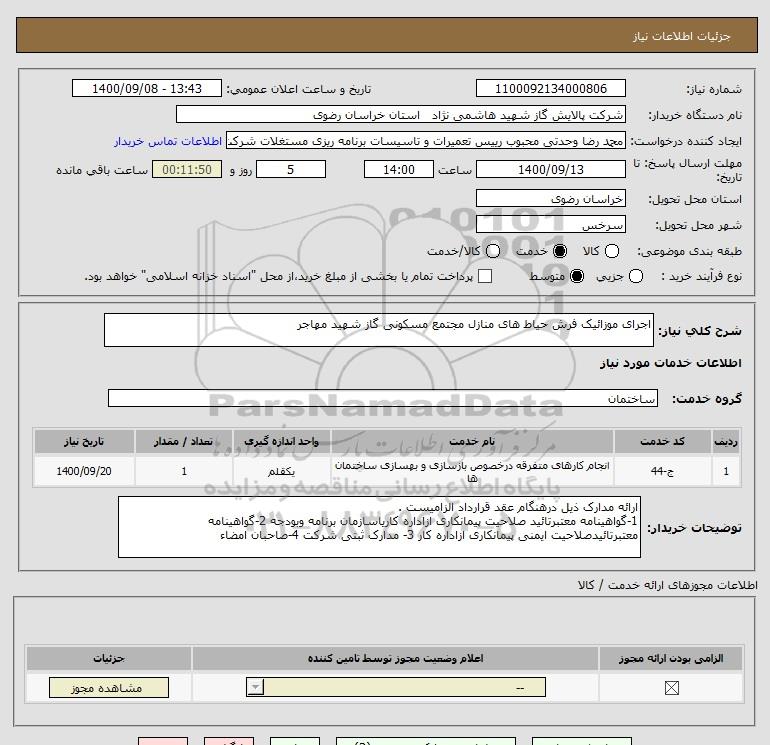 شرح کلی نیاز: اجرای موزائیک فرش حیاط های منازل مجتمع مسکونی گاز شهید مهاجر