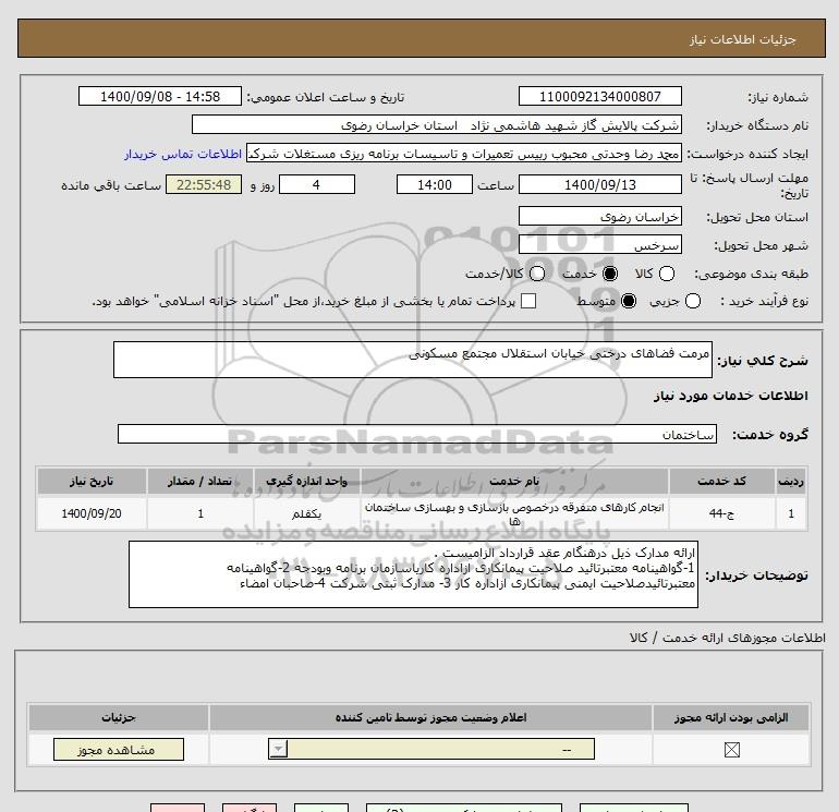 نام دستگاه خریدار:شرکت پالایش گاز شهید هاشمی نژاد استان خراسان رضوی