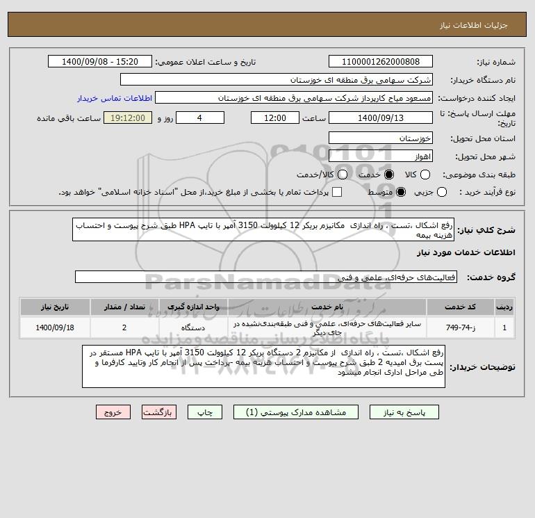 شرح کلی نیاز: رفع اشکال ،تست ، راه اندازی مکانیزم بریکر 12 کیلوولت 3150 آمپر با تایپ HPA طبق شرح پیوست و احتساب هزینه بیمه