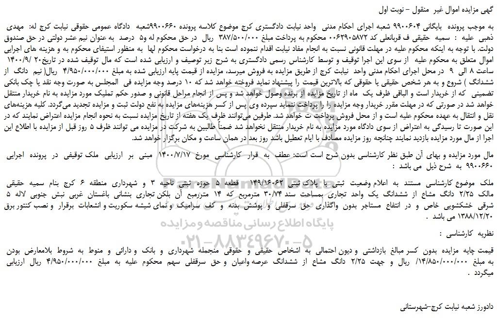 به موجب پرونده  بایگانی 9900604 شعبه اجرای احکام مدنی  واحد نیابت دادگستری کرج موضوع کلاسه پرونده 9900660شعبه  دادگاه عمومی حقوقی نیابت کرج له:  مهدی  ذهبی  علیه  :  سمیه  حقیقی ف قربانعلی کد 0062905872 محکوم به پرداخت مبلغ 387/500/000  ریال  در حق محکوم له و5  درصد  به عنوان نیم عشر دولتی در حق صندوق دولت. با توجه به اینکه محکوم علیه در مهلت قانونی نسبت به انجام مفاد نیابت اقدام ننموده است بنا به درخواست محکوم لها  به منظور استیفای محکوم به و هزینه های اجرایی اموال متعلق به محکوم علیه  از سوی این اجرا توقیف و توسط کارشناس رسمی دادگستری به شرح زیر توصیف و ارزیابی شده است که مال توقیف شده در تاریخ20 /1400/9  ساعت 8 الی  9  در محل اجرای احکام مدنی واحد  نیابت کرج از طریق مزایده به فروش میرسد، مزایده از قیمت پایه ارزیابی شده به مبلغ 4/950/000/000  ریال( نیم  دانگ  از ششدانگ ) شروع و به هر شخص حقیقی یا حقوقی که بالاترین قیمت را پیشنهاد نماید فروخته خواهد شد که 10 درصد وجه مزایده فی  المجلس به صورت وجه نقد یا چک بانکی تضمینی  که از خریدار است و الباقی ظرف یک  ماه از تاریخ مزایده از برنده وصول خواهد شد و پس از انجام مراحل قانونی و صدور حکم تملیک مورد مزایده به نام خریدار منتقل خواهد شد در صورتی که در مهلت مقرر خریدار وجه مزایده را را پرداخت ننماید سپرده وی پس از کسر هزینه های مزایده به نفع دولت ثبت و مزایده تجدید می گردد. کلیه هزینه های نقل و انتقال به عهده محکوم علیه است و از محل فروش پرداخت ت خواهد شد. طرفین می توانند ظرف یک هفته از تاریخ مزایده نسبت به نحوه انجام مزایده اعتراض نمایند که در این صورت تا رسیدگی به اعتراض از سوی دادگاه مورد مزایده به نام خریدار منتقل نخواهد شد ضمناً طالبین به شرکت در مزایده می توانند ظرف 5 روز قبل از مزایده با اطلاع این اجرا از مال مورد مزایده بازدید نمایند چنانچه روز مزایده مصادف با ایام تعطیل باشد روز بعد در همان ساعت و مکان برگزار خواهد شد.