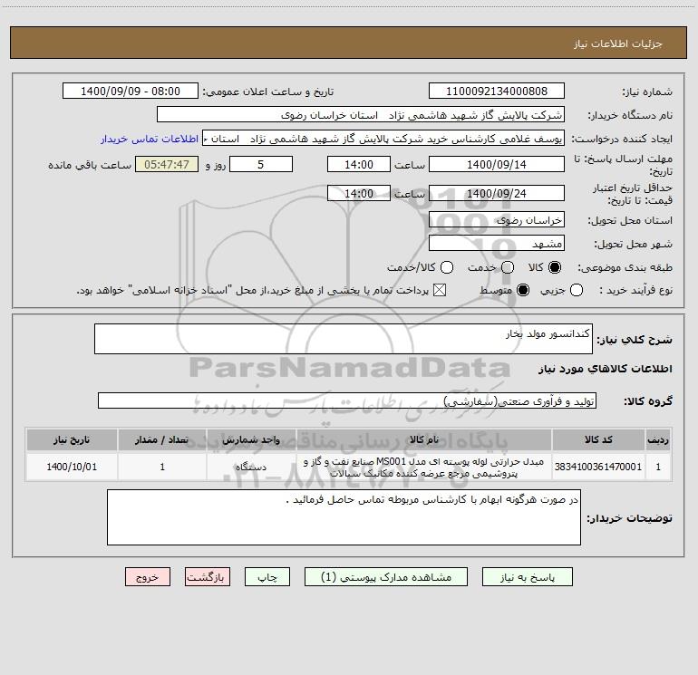 شرح کلی نیاز: کندانسور مولد بخار
