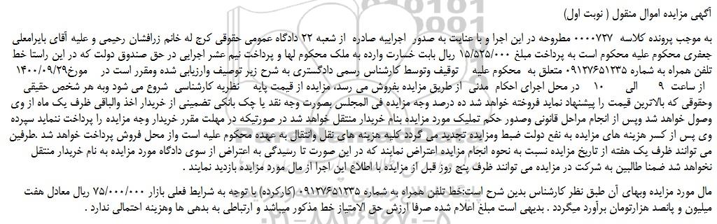 به موجب پرونده کلاسه 0000727 مطروحه در این اجرا و با عنایت به صدور اجراییه صادره از شعبه 22 دادگاه عمومی حقوقی کرج له خانم زرافشان رحیمی و علیه آقای بایرامعلی جعفری محکوم علیه محکوم است به پرداخت مبلغ 15/525/000 ریال بابت خسارت وارده به ملک محکوم لها و پرداخت نیم عشر اجرایی در حق صندوق دولت که در این راستا خط تلفن همراه به شماره 09127651235 متعلق به محکوم علیه توقیف وتوسط کارشناس رسمی دادگستری به شرح زیر توصیف وارزیابی شده ومقرر است در مورخ1400/09/29 از ساعت 9 الی 10 در محل اجرای احکام مدنی از طریق مزایده بفروش می رسد، مزایده از قیمت پایه نظریه کارشناسی شروع می شود وبه هر شخص حقیقی وحقوقی که بالاترین قیمت را پیشنهاد نماید فروخته خواهد شد ده درصد وجه مزایده فی المجلس بصورت وجه نقد یا چک بانکی تضمینی از خریدار اخذ والباقی ظرف یک ماه از وی وصول خواهد شد وپس از انجام مراحل قانونی وصدور حکم تملیک مورد مزایده بنام خریدار منتقل خواهد شد در صورتیکه در مهلت مقرر خریدار وجه مزایده را پرداخت ننماید سپرده وی پس از کسر هزینه های مزایده به نفع دولت ضبط ومزایده تجدید می گردد کلیه هزینه های نقل وانتقال به عهده محکوم علیه است واز محل فروش پرداخت خواهد شد .طرفین می توانند ظرف یک هفته از تاریخ مزایده نسبت به نحوه انجام مزایده اعتراض نمایند که در این صورت تا رسیدگی به اعتراض از سوی دادگاه مورد مزایده به نام خریدار منتقل نخواهد شد ضمنا طالبین به شرکت در مزایده می توانند ظرف پنج روز قبل از مزایده با اطلاع این اجرا از مال مورد مزایده بازدید نمایند .