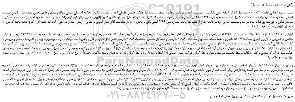 شماره پرونده اجرایی: کلاسه 0000941 شعبه اول اجرای احکام مدنی دادگستری شهرستان اردبیل در راستای دادنامه صادره از شعبه اول دادگاه عمومی حقوقی اردبیل  مطروحه مابین، محکوم له : تقی شهابی ونداقدم محکوم علیهم:مجتبی ومجید فعال قیومی بصورت تضامنی محکوم هستند به مبلغ4/000/000/000ریال اصل خواسته ومبلغ139/694/400ریال هزینه دادرسی ومبلغ79/200/000ریال حق الوکاله وکیل وخسارت تاخیر تادیه ازتاریخ صدوربر مبنای نرخ تورم بانک مرکزی درحق محکوم له ومبلغ 200/000/000ریال نیمعشر دولتی درحق صندوق دولت،مورد مزایده و توصیف اجمالی آن: سه دانگ مشاع از ششدانگ پلاک بشماره ثبتی 4466 اصلی واقع در بخش 1 اردبیل بمالکیت آقای فعال قیومی به نشانی- اردبیل- میدان شریعتی- آیت الله خامنه ای- کوچه شهید محمد کریمی  به شرح زیر ارزیابی و برآورد قیمت شده است؛