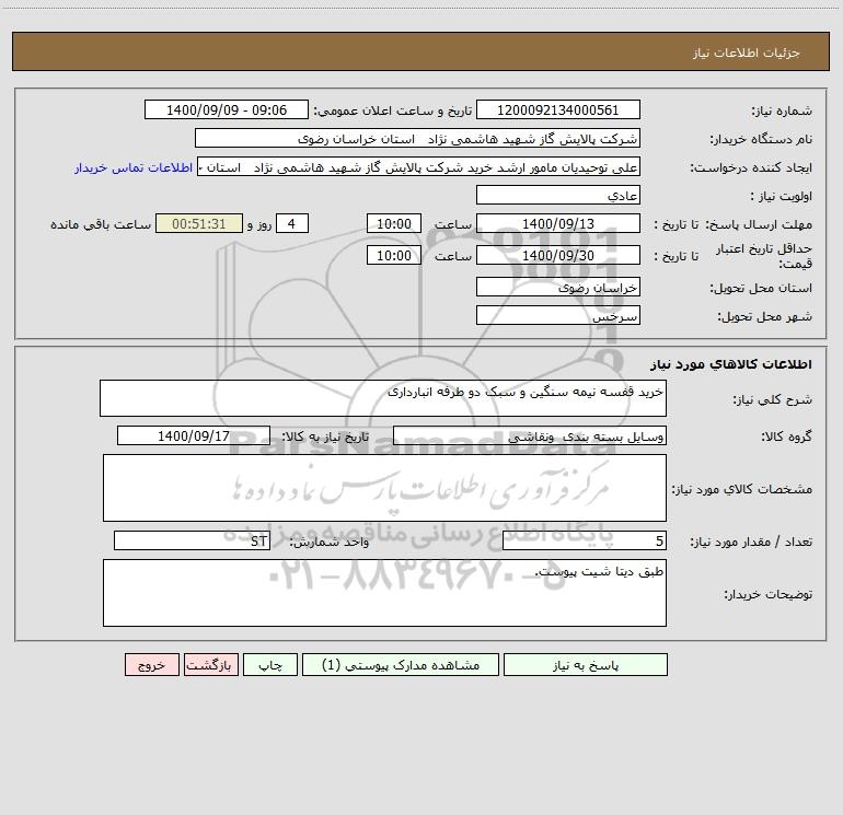 نام دستگاه خریدار:شرکت پالایش گاز شهید هاشمی نژاد استان خراسان رضوی
