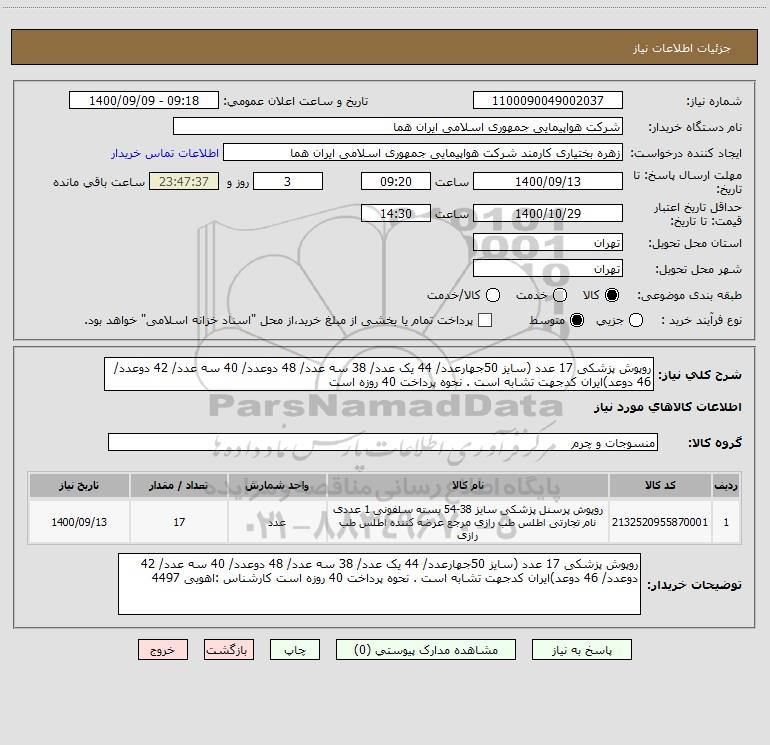 شرح کلی نیاز: روپوش پزشکی 17 عدد (سایز 50جهارعدد/ 44 یک عدد/ 38 سه عدد/ 48 دوعدد/ 40 سه عدد/ 42 دوعدد/ 46 دوعد)ایران کدجهت تشابه است . نحوه پرداخت 40 روزه است