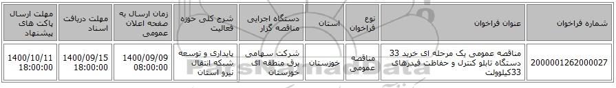 | 2000001262000027 | مناقصه عمومی یک مرحله ای خرید 33 دستگاه تابلو کنترل و حفاظت فیدرهای 33کیلوولت | مناقصه عمومی | خوزستان | شرکت سهامی برق منطقه ای خوزستان | پایداری و توسعه شبکه انتقال نیرو استان | 1400/09/09 08:00:00 | 1400/09/15 18:00:00 | 1400/10/11 18:00:00 |