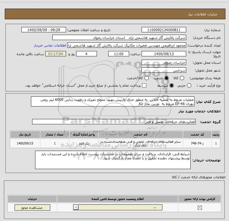 نام دستگاه خریدار:شرکت پالایش گاز شهید هاشمی نژاد استان خراسان رضوی