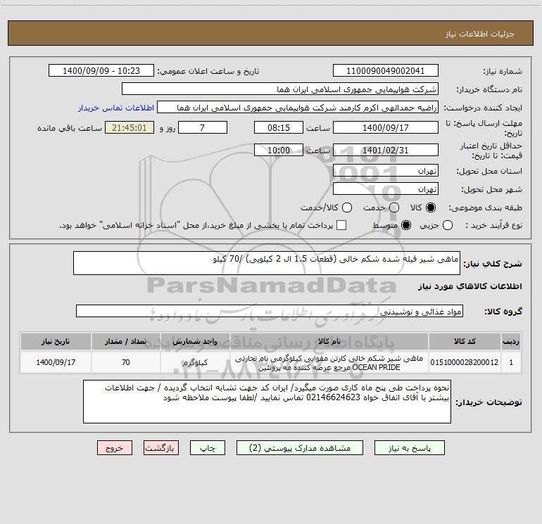شرح کلی نیاز: ماهی شیر فیله شده شکم خالی (قطعات 1.5 ال 2 کیلویی) /70 کیلو