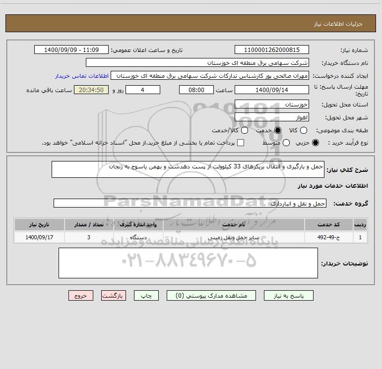 شرح کلی نیاز: حمل و بارگیری و انتقال بریکرهای 33 کیلوولت از پست دهدشت و بهمن یاسوج به زنجان