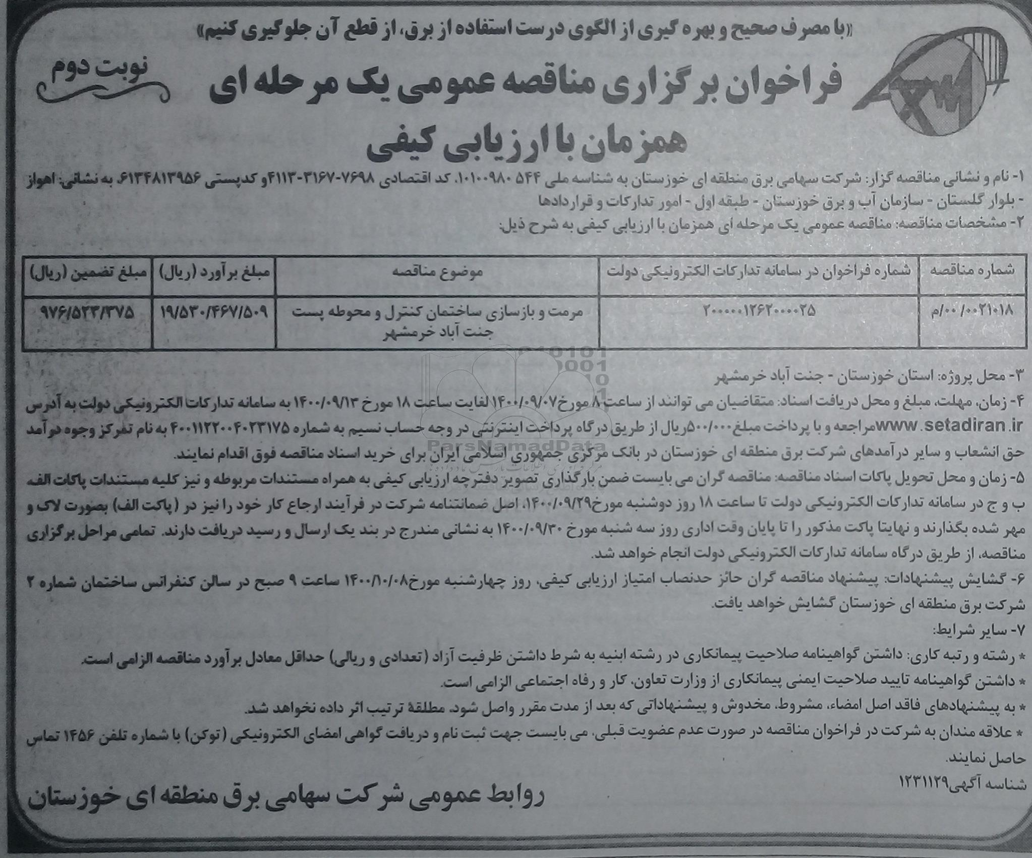 | 00/0021018/م | 2000001262000025 | مرمت و بازسازی ساختمان کنترل و محوطه پست جنت آباد خرمشهر | 19.530.467.509 | 976.523.375 |