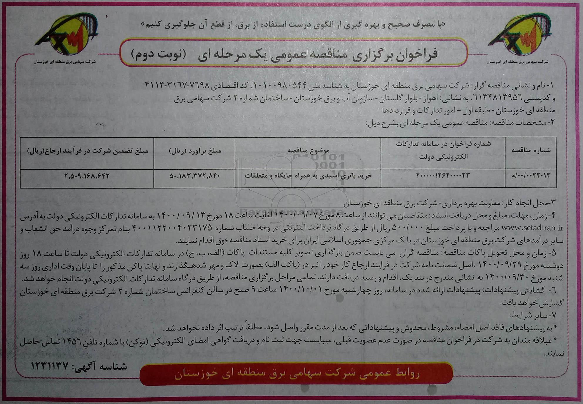 | م/00/0022013 | 2000001262000023 | خرید باتری اسیدی به همراه جایگاه و متعلقات | 50.183.372.840 | 2.509.168.642 |