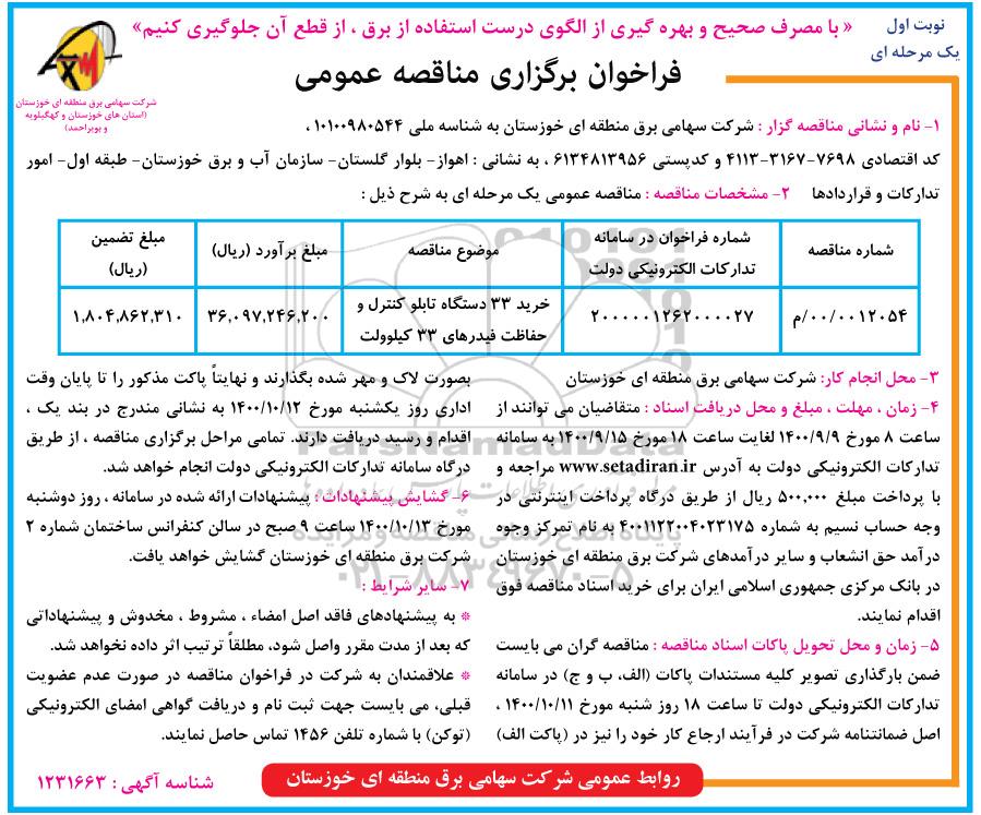 1. نام و نشانی مناقصه گزار: شرکت سهامی برق منطقه ای خوزستان به شناسه ملی