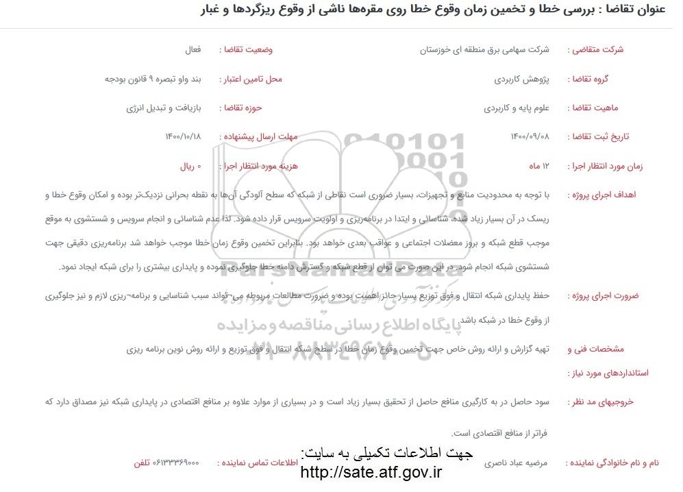 علاقهمندان میتوانند جهت دریافت اسناد و اطلاعات تکمیلی، فراخوان بررسی خطا و تخمین زمان وقوع خطا روی مقره ها ناشی از وقوع ریزگردها و غبار با سامانه مناقصات و مزایدات ایران پارسنماد داده ها 88349670 تماس حاصل نمایند.