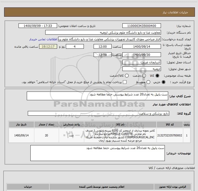 شرح کلی نیاز: ست پایپل به تعداد20 عدد شرایط پیوستی حتما مطالعه شود