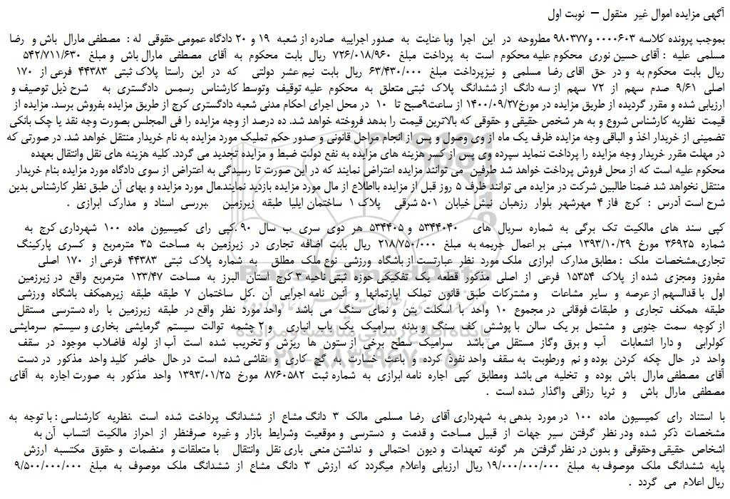 بموجب پرونده کلاسه 0000603 و980377 مطروحه  در  این  اجرا  وبا عنایت  به  صدور اجراییه  صادره از شعبه  19 و 20 دادگاه عمومی حقوقی  له :  مصطفی مارال  باش و  رضا مسلمی  علیه  : آقای حسین نوری  محکوم علیه محکوم  است  به  پرداخت  مبلغ  726/018/960  ریال  بابت  محکوم  به  آقای  مصطفی  مارال باش  و مبلغ  542/711/630  ریال  بابت  محکوم به  و در  حق  اقای رضا  مسلمی  و  نیزپرداخت  مبلغ  63/430/000  ریال  بابت  نیم عشر  دولتی    که  در  این  راستا  پلاک ثبتی  44383  فرعی از  170  اصلی  9/61  صدم  سهم  از  72  سهم  از سه دانگ  از ششدانگ  پلاک  ثبتی متعلق  به  محکوم  علیه توقیف  وتوسط کارشناس  رسمس  دادگستری  به    شرح ذیل توصیف و ارزیابی شده و مقرر گردیده از طریق مزایده در مورخ1400/09/27 از ساعت9صبح تا  10  در محل اجرای احکام مدنی شعبه دادگستری کرج از طریق مزایده بفروش برسد. مزایده از قیمت  نظریه کارشناس شروع و به هر شخص حقیقی و حقوقی که بالاترین قیمت را بدهد فروخته خواهد شد. ده درصد از وجه مزایده را فی المجلس بصورت وجه نقد یا چک بانکی تضمینی از خریدار اخذ و الباقی وجه مزایده ظرف یک ماه از وی وصول و پس از انجام مراحل قانونی و صدور حکم تملیک مورد مزایده به نام خریدار منتقل خواهد شد. در صورتی که در مهلت مقرر خریدار وجه مزایده را پرداخت ننماید سپرده وی پس از کسر هزینه های مزایده به نفع دولت ضبط و مزایده تجدید می گردد. کلیه هزینه های نقل وانتقال بعهده محکوم علیه است که از محل فروش پرداخت خواهد شد طرفین  می توانند مزایده اعتراض نمایند که در این صورت تا رسیدگی به اعتراض از سوی دادگاه مورد مزایده بنام خریدار منتقل نخواهد شد ضمنا طالبین شرکت در مزایده می توانند ظرف 5 روز قبل از مزایده بااطلاع از مال مورد مزایده بازدید نمایند.مال مورد مزایده و بهای آن طبق نظر کارشناس بدین شرح است آدرس  :  کرج  فاز 4  مهرشهر  بلوار  رزهبان  نبش خیابان  501 شرقی    پلاک 1  ساختمان ایلیا  طبقه  زیرزمین    .بررسی  اسناد  و  مدارک  ابرازی  .