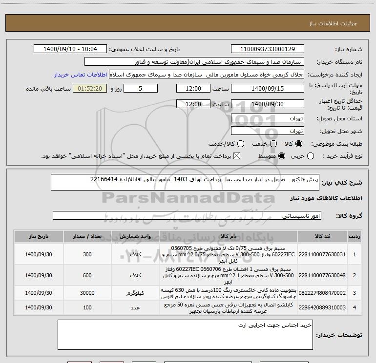 شرح کلی نیاز: پیش فاکتور تحویل در انبار صدا وسیما پرداخت اوراق 1403 مامور مالی اقابالازاده 22166414
