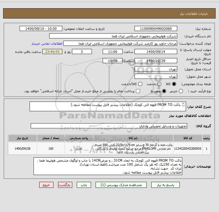 توضیحات خریدار:پاکت FROM TO قهوه ائی کوچک به ابعاد 31CM , و عرض14CM با چاپ و لوگوی مشخص هواپیما هما . به تعداد 150پک که هر پک شامل 100 عدد میباشد.(فقط استان تهران). ایران کد جهت تشابه. اطلاعات بیشتر فایل پیوست مطالعه شود.