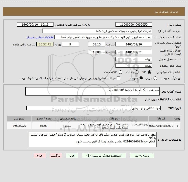 شرح کلی نیاز: پودر شیر 3 گرمی با آرم هما /50000 عدد