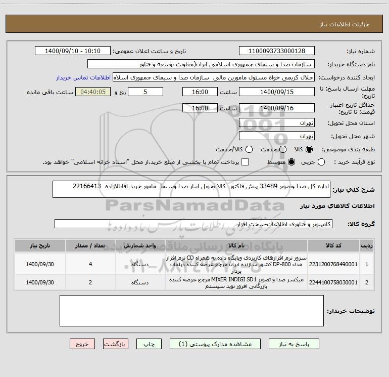 شرح کلی نیاز: اداره کل صدا وتصویر 33489 پیش فاکتور کالا تحویل انبار صدا وسیما مامور خرید اقابالازاده 22166413