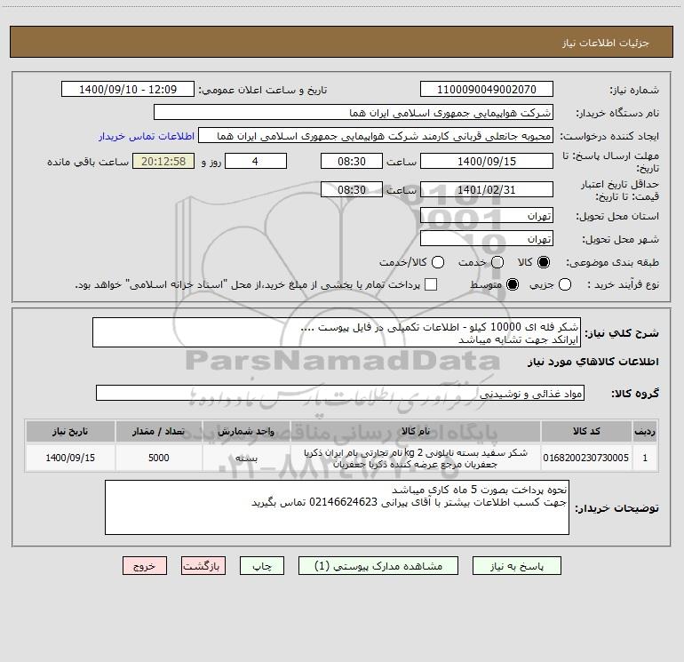 شرح کلی نیاز: شکر فله ای 10000 کیلو - اطلاعات تکمیلی در فایل پیوست .... ایرانکد جهت تشابه میباشد
