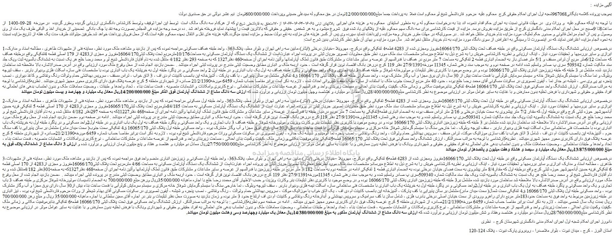 با توجه به اینکه محکوم علیه و وراث وی در مهلت قانونی نسبت به اجرای حکم اقدام ننموده اند بنا به درخواست محکوم له و به منظور استیفای محکوم به و هزینه های اجرایی پلاکهای ثبتی 16065-16064-16066 از 170متعلق به قارداشعلی شیخ لو که از هرکدام سه دانگ مالک است توسط این اجرا توقیف وتوسط کارشناس دادگستری ارزیابی گردیده ومقرر گردیده در مورخه 28-09-1400 از ساعت8تا 9صبح در محل اجرای احکام مدنی دادگستری کرج از طریق مزایده بفروش برسد. مزایده از قیمت کارشناسی برای سه دانگ سهم محکوم علیه از پلاکهای یاد شده فوق شروع میشود و به هر شخص حقیقی و حقوقی که بالاترین قیمت را پیشنهاد نماید فروخته خواهد شد . ده درصد وجه مزایده فی المجلس بصورت وجه نقد یا چک بانکی تضمینی از خریدار اخذ و الباقی ظرف یک ماه از وی وصول و پس از انجام مراحل قانونی و صدور حکم تملیک مورد مزایده بنام خریدار منتقل خواهد شد . در صورتیکه در مهلت مقرر خریدار وجه مزایده راپرداخت ننماید سپرده وی پس از کسر هزینه های مزایده به نفع دولت ضبط و مزایده تجدید میگردد.کلیه هزینه های نقل و انتقال بعهده محکوم علیه است.که از محل فروش پرداخت خواهد شد.طرفین میتوانند ظرف مدت یک هفته از تاریخ مزایده نسبت به نحوه انجام مزایده اعتراض نمایند که در اینصورت تا رسیدگی به اعتراض از سوی دادگاه مورد مزایده به نام خریدار منتقل نخواهد شد. مال مورد مزایده و بهای آن طبق نظر کارشناس بدین شرح است: