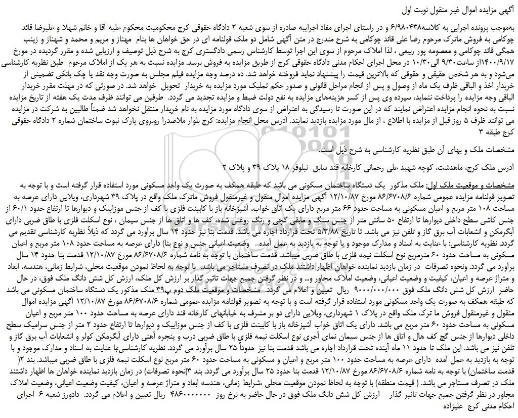 به موجب پرونده اجرایی به کلاسه۶/۹۸۰۴۳۸ و در راستای اجرای مفاد اجراییه صادره از سوی شعبه ۲ دادگاه حقوقی کرج محکومیت محکوم علیه آقا و خانم شهلا و علیرضا قائد چوکامی به فروش ماترک مرحوم رضا علی قائد چوکامی به شرح مندرج در متن آگهی شامل دو ملک قولنامه ای در حق خواهان ها بنام  مهناز و مریم و محمد و شهناز و زینب همگی قائد چوکامی و معصومه پور ربیعی ، لذا املاک مرحوم از سوی این اجرا توسط کارشناس رسمی دادگستری کرج به شرح ذیل توصیف و ارزیابی شده و مقرر گردیده در مورخ 1400/9/17از ساعت9/30 الی10/30 در محل اجرای احکام مدنی دادگاه حقوقی کرج از طریق مزایده به فروش برسد. مزایده نسبت به هر یک از املاک مرحوم  طبق نظریه کارشناسی شروع می شود و به هر شخص حقیقی و حقوقی که بالاترین قیمت را پیشنهاد نماید فروخته خواهد شد. ده درصد وجه مزایده فیلم مجلس به صورت وجه نقد یا چک بانکی تضمینی از خریدار اخذ و الباقی ظرف یک ماه از وصول و پس از انجام مراحل قانونی و صدور حکم تملیک مورد مزایده به خریدار  تحویل  خواهد شد. در صورتی که در مهلت مقرر خریدار الباقی وجه مزایده را پرداخت ننماید، سپرده وی پس از کسر هزینه های مزایده به نفع دولت ضبط و مزایده تجدید می گردد.  طرفین می توانند ظرف مدت یک هفته از تاریخ مزایده نسبت به نحوه انجام مزایده اعتراض نمایند که در این صورت تا رسیدگی به اعتراض از سوی دادگاه مورد مزایده به نام خریدار منتقل نخواهد شد ضمناً طالبین به شرکت در مزایده می توانند ظرف ۵ روز قبل از مزایده با اطلاع ، از مال مورد مزایده بازدید نمایند. آدرس محل انجام مزایده: کرج بلوار ملاصدرا روبروی پارک نبوت ساختمان شماره ۲ دادگاه حقوقی کرج طبقه ۳