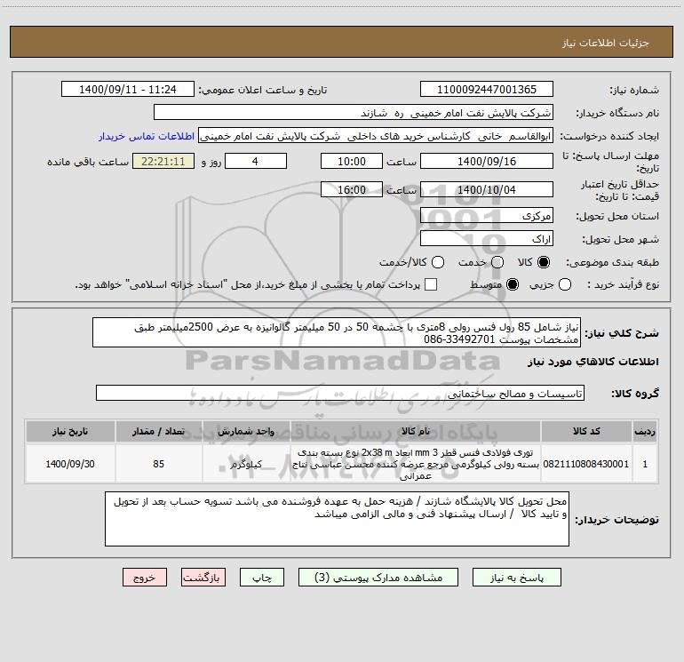 شرح کلی نیاز: نیاز شامل 85 رول فنس رولی 8متری با چشمه 50 در 50 میلیمتر گالوانیزه به عرض 2500میلیمتر طبق مشخصات پیوست 33492701-086