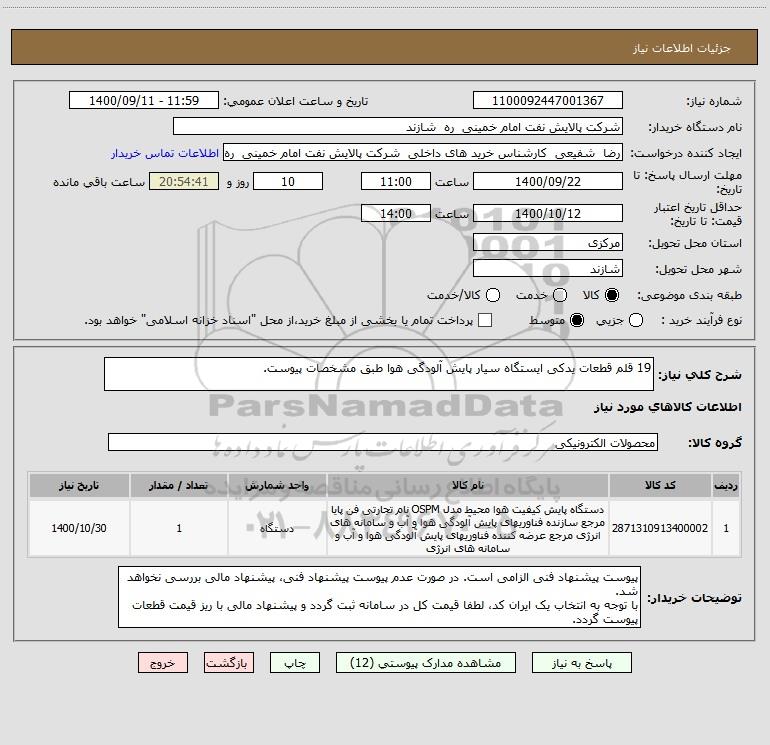شرح کلی نیاز: 19 قلم قطعات یدکی ایستگاه سیار پایش آلودگی هوا طبق مشخصات پیوست.