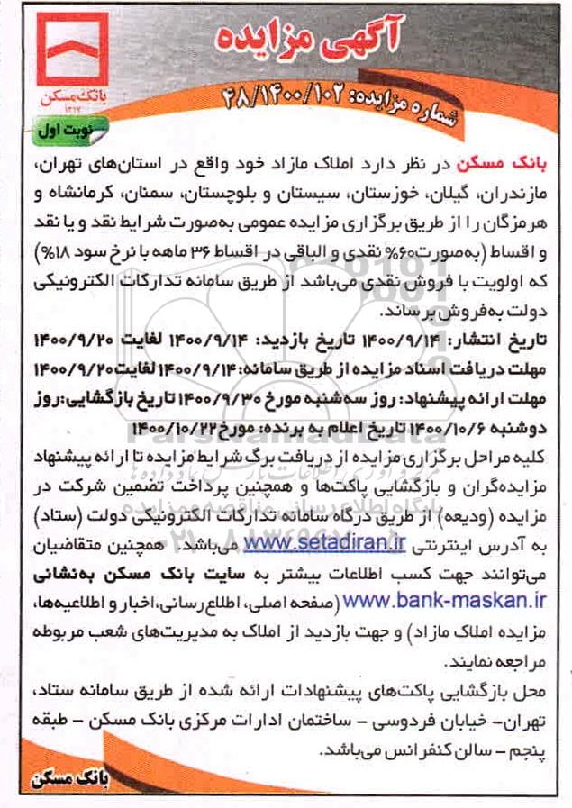 مزایده فروش املاک مازاد نوبت اول شماره 48.1400.102