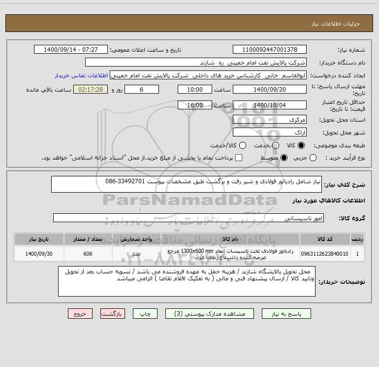 شرح کلی نیاز: نیاز شامل رادیاتور فولادی و شیر رفت و برگشت طبق مشخصات پیوست 33492701-086
