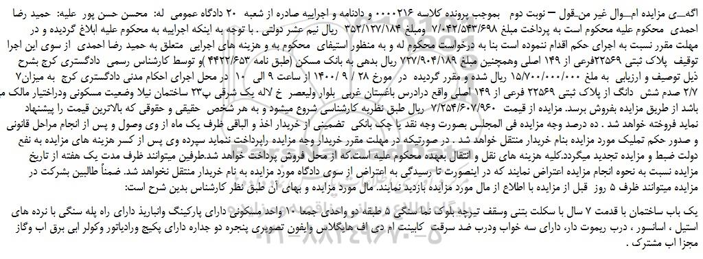 اگهــی مزایده امــوال غیر منـقول – نوبت دوم بموجب پرونده کلاسه 0000216 و دادنامه و اجراییه صادره از شعبه 20 دادگاه عمومی له: محسن حسن پور علیه: حمید رضا احمدی محکوم علیه محکوم است به پرداخت مبلغ 7/042/543/698 ومبلغ 352/127/184 ریال نیم عشر دولتی . با توجه به اینکه اجراییه به محکوم علیه ابلاغ گردیده و در مهلت مقرر نسبت به اجرای حکم اقدام ننموده است بنا به درخواست محکوم له و به منظور استیفای محکوم به و هزینه های اجرایی متعلق به حمید رضا احمدی از سوی این اجرا توقیف پلاک ثبتی 22569فرعی از 149 اصلی وهمچنین مبلغ 727/904/189 ریال بدهی به بانک مسکن (طبق نامه 4422/653 )و توسط کارشناس رسمی دادگستری کرج بشرح ذیل توصیف و ارزیابی به ملغ 15/700/000/000 ریال شده و مقرر گردیده در مورخ 28 / 9 /1400 از ساعت 9 الی 10 در محل اجرای احکام مدنی دادگستری کرج به میزان7 2/7 صدم شش دانگ از پلاک ثبتی 22569 فرعی از 149 اصلی واقع درادرس باغستان غربی بلوار ولیعصر خ لاله یک شرقی پ23 ساختمان نیلا وضعیت مسکونی ودراختیار مالک می باشد از طریق مزایده بفروش برسد. مزایده از قیمت 7/254/607/960 ریال طبق نظریه کارشناسی شروع میشود و به هر شخص حقیقی و حقوقی که بالاترین قیمت را پیشنهاد نماید فروخته خواهد شد . ده درصد وجه مزایده فی المجلس بصورت وجه نقد یا چک بانکی تضمینی از خریدار اخذ و الباقی ظرف یک ماه از وی وصول و پس از انجام مراحل قانونی و صدور حکم تملیک مورد مزایده بنام خریدار منتقل خواهد شد . در صورتیکه در مهلت مقرر خریدار وجه مزایده راپرداخت ننماید سپرده وی پس از کسر هزینه های مزایده به نفع دولت ضبط و مزایده تجدید میگردد.کلیه هزینه های نقل و انتقال بعهده محکوم علیه است.که از محل فروش پرداخت خواهد شد.طرفین میتوانند ظرف مدت یک هفته از تاریخ مزایده نسبت به نحوه انجام مزایده اعتراض نمایند که در اینصورت تا رسیدگی به اعتراض از سوی دادگاه مورد مزایده به نام خریدار منتقل نخواهد شد. ضمناً طالبین بشرکت در مزایده میتوانند ظرف 5 روز قبل از مزایده با اطلاع از مال مورد مزایده بازدید نمایند. مال مورد مزایده و بهای آن طبق نظر کارشناس بدین شرح است: