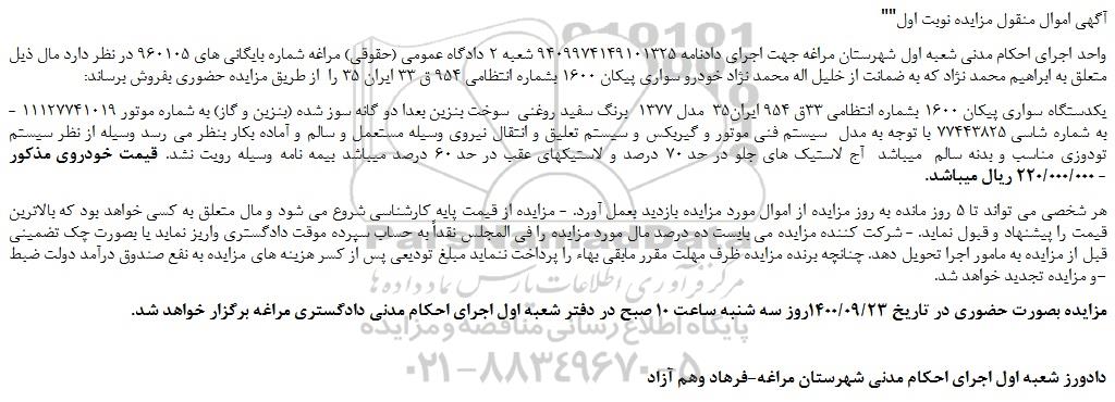 واحد اجرای احکام مدنی شعبه اول شهرستان مراغه جهت اجرای دادنامه 9409974149101325 شعبه 2 دادگاه عمومی (حقوقی) مراغه شماره بایگانی های 960105 در نظر دارد مال ذیل متعلق به ابراهیم محمد نژاد که به ضمانت از خلیل اله محمد نژاد خودرو سواری پیکان 1600 بشماره انتظامی 954 ق 33 ایران 35 را از طریق مزایده حضوری بفروش برساند: